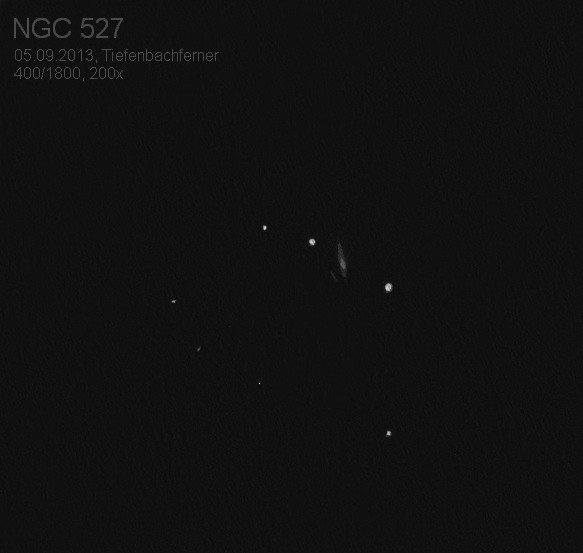 Martin rief nach Kaffee und meine Handschuhe gingen mir auf die Nerven. Es ging nun 40' in südwestliche Richtung, wo sich NGC 527 herumtrieb. Eine Galaxie länglicher Gestalt, 1:3,5 und in N-S-Lage. Bei 200x löste sich, parallel zur Hauptachse, knapp westlich gelegen, die kleine Begleiterin NGC 527 B heraus, und zeigte sich als wesentlich flaueres, längliches Nebelchen mit gleichbleibender Helligkeit auf der gesamten Fläche.