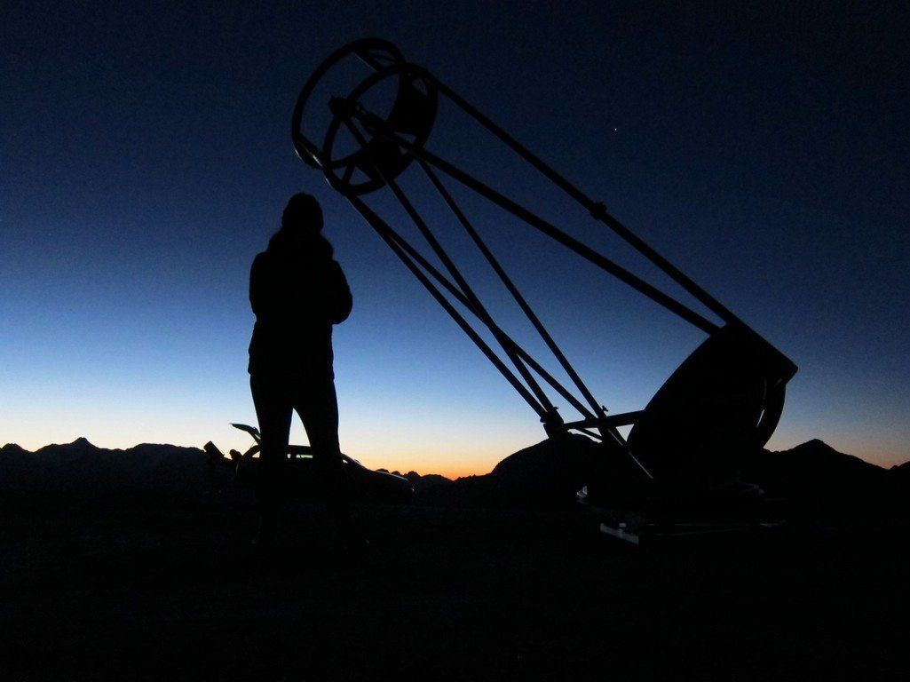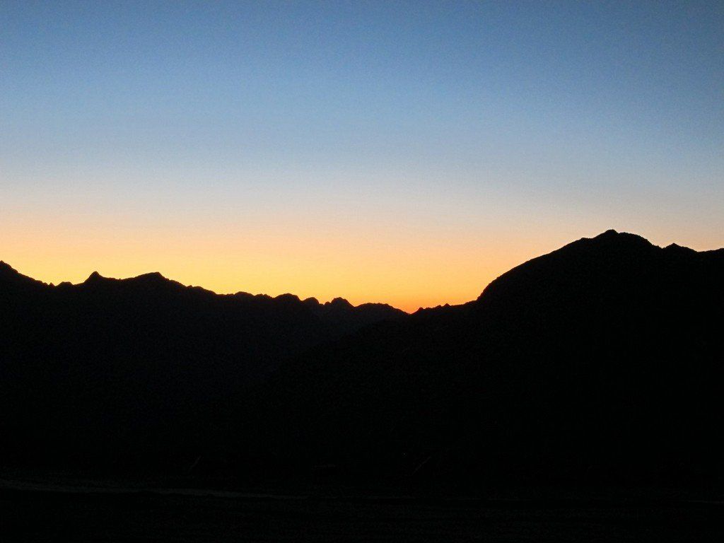 Als ich am Nachmittag dann im Bett lag, schlief ich während des Berichtschreibens ein und wachte pünktlich zum Abendessen auf. Von wegen Urlaub, das ist harte Arbeit... Es hatte sich tagsüber kein einziges Wölkchen gezeigt. Stattdessen schien die freundliche Sonne von einem tiefblauen, klaren Himmel und weckte in uns die Vorfreude auf die kommenden Stunden. Schon recht früh, bei lauschigen 10°C, erreichten wir den Beobachtungsplatz, wo Uwe Glahn und Costa bereits ihr Refugium bezogen hatten. Die alpine Abenddämmerung haut einen jedes Mal aufs Neue vom Hocker, wenn die oberen Berggipfel scheinbar aus sich heraus leuchteten und dahinter der Erdschatten aufstieg. Ein scharfes, dunkelblaues Band, das jäh in sämtliche Pink- und Rottöne überging. Ich ging umher, machte Fotos, stellte meinen Kram auf und bekam einen Schreck, als ich sah, dass Tauwasser auf meinem Spiegel war. Während des Auskühlprozesses verschwand er allerdings, sodass ich nicht den Fön bemühen musste.