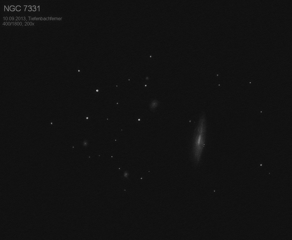 Auf den Autoscheiben hatte sich die dünne Eisschicht verstärkt und meine Picknickdecke glitzerte. Nun widmete ich mich einem Objekt, das ich zuletzt 2009 und mit nur 10 Zoll Öffnung besucht hatte, an eben diesem Ort. NGC 7331: „Knallhelle Galaxie“ in Seitenansicht, Achsenverhältnis von 1:4. Gut abgegrenzt vom Hintergrund und ein helles, längliches Zentralgebiet. Naja, das Ding kennt man schon. Viel interessanter fand ich die kleinen Begleitgalaxien, die ich nicht beschrieb, sondern bloß zeichnerisch portraitierte.