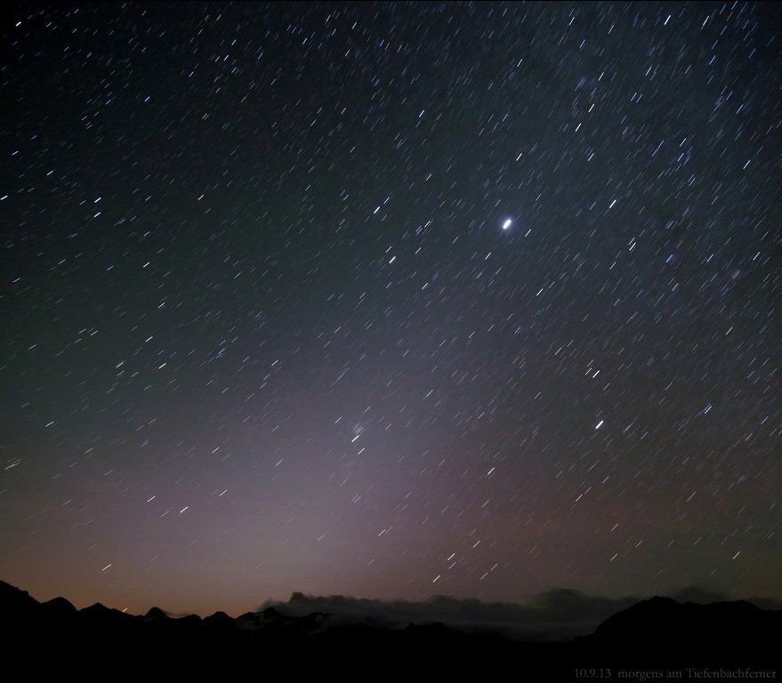 Brr. A bisserl koalt. 03:14 Uhr, und ich lief den sanften Abhang runter, bis ich am Abgrund stand und mich zum Beobachtungsplatz umdrehte, hinter dem der weiß leuchtende, mächtige Tiefenbachgletscher aufragte. Man hörte leises Steinpoltern. „Ja, Wahnsinn“, entkam es mir. Die Milchstraße verschwand schon hinterm Berg und Atair ragte gerade noch so als heller Leuchtturm drüber. Das Zodiakalband zog sich auffällig entlang der gedachten Linie der Ekliptik, bis es sich mit der Milchstraße östlich des Stiers vereinigte. Wie der höchstpersönliche Platzhirsch der Ötztaler Alpen thronte der Orion im Südosten, dessen helle, blinkende Hauptsterne sich förmlich in die Netzhaut brannten. So, als würde er mich gleich erschlagen. Heiliges Kanonenrohr! Es war unglaublich. Der beste Himmel, den ich je an diesem Standort hatte. Wahn-sinn. Es war nirgendwo mehr eine Wolke zu sehen, es hatte sich alles aufgelöst, und selbst das Streulicht, das von Italien im tiefen Süden aufragte, war nur ein fader, kaum auffälliger Streifen am Horizont. Ich rannte wieder zurück, stolperte über die Fahrrinnen und das Rauschen des Baches kehrte zurück. -1°C. Die Männer klagten über die Kälte, mir hingegen war es recht angenehm. Das SQM-L gab, für mehrere Himmelsrichtungen, 21,72 mag/arcsec² an.