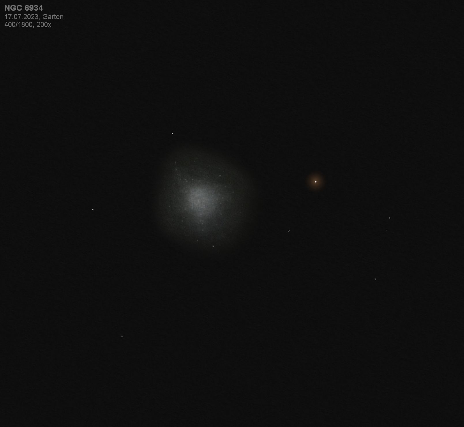 Kugelsternhaufen Nr. 2 war NGC 6934, der kleine kompakte Ballen im Delphin. Bei 138x sehr körnig und grieselig, ohne allerdings konkrete Einzelsterne preiszugeben. Die wollten sich ansatzweise bei 200x zeigen; verstreut blitzten stellare Peaks heraus und verschwanden wieder, bevor ich sie richtig verorten konnte. Alles sehr dicht, sehr eng, kompakt. Der Feldstern westlich von NGC 6934 zeigte sich in sattem Orange.